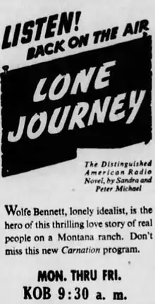 Lone Journey debuted on May 27, 1940, on NBC. The show was called, "the distinguished American radio novel" and was advertised as "thrilling romance on a Montana ranch".[1] Notably, the show did not make much use of cliffhangers to lure viewers in. The show used Montana as its setting and was based on real people and real situations that the show's writers, Sandra Michael and Peter Michael, had experienced.[2][3][4][5][6][7] Sandra had prior experience writing the radio daytime soap opera Against the Storm.[8]