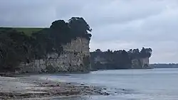 The eastern coast is occupied by the Long Bay Regional Park, and the shoreline is in Long Bay-Okura Marine Reserve, which opened in 1995.[16] The beach is sandy and swimming is safe. It offers forest walks and scenic cliffs.[17] This beach has low tide water.[18][19] Smaller beaches to the north, such as Pohutukawa Bay, accessible except at high tide, are among Auckland's most popular naturist spots;[9][20] The headland at the northeast of the suburb is called Piripiri Point.[21]