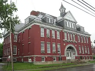 The former Longfellow School building is located in central Rutland, on the east side of Church Street near its junction with West Street. It is a 2-1/2 story brick building, with a hip roof and a raised basement, which is separated from the ground floor by a stone beltcourse. Gabled wings project slightly to either side, and the roof is pierced by a number of hip-roof dormers. The front facade is twelve bays wide, with a four-bay gabled section projecting from the roof above the central bays, topped by an octagonal belfry. The main entrance is recessed in a round-arch opening that occupies the center four bays. Windows on the other bays have rusticated stone sills and lintels, with the upper-floor lintels joined in a continuous band. The central four windows on the second floor are articulated by slightly projecting pilasters supported by stone brackets.[2]