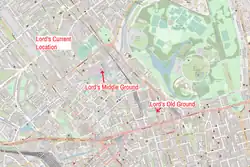 Acting on behalf of members of the White Conduit Club and backed against any losses by George Finch, 9th Earl of Winchilsea and Colonel Charles Lennox, Thomas Lord opened his first ground in May 1787 on the site where Dorset Square now stands, on land leased from the Portman Estate.[4] The White Conduit moved there from Islington, unhappy at the standard of the ground at White Conduit Fields, soon afterwards and reconstituted themselves as Marylebone Cricket Club (MCC). It was thought that the establishment of a new ground would offer more exclusivity to its members, with White Conduit Fields considered too far away from fashionable Oxford Street and the West End.[5] The first match played at the new ground saw Middlesex play Essex.[6][7] In 1811, feeling obliged to relocate because of a rise in rent, Lord removed his turf and relaid it at his second ground. This was short-lived because it lay on the route decided by Parliament for the Regent's Canal, in addition to the ground being unpopular with patrons.[7][6]
