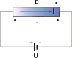 The mathematical expression of the law can be derived as following. Electrical conduction of metals is a well-known phenomenon and is attributed to the free conduction electrons, which can be measured as sketched in the figure. The current density j is observed to be proportional to the applied electric field and follows Ohm's law where the prefactor is the specific electrical conductivity. Since the electric field and the current density are vectors Ohm's law is expressed here in bold face. The conductivity can in general be expressed as a tensor of the second rank (3×3 matrix). Here we restrict the discussion to isotropic, i.e. scalar conductivity. The specific resistivity is the inverse of the conductivity. Both parameters will be used in the following.