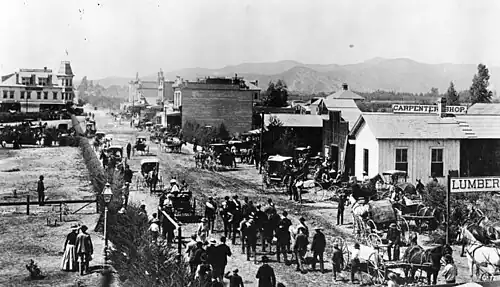 With the goal of connecting all of the San Gabriel Valley, in November 1886 the Los Angeles and San Gabriel Valley Railroad started building a line West from Mud Springs (what is now San Dimas). By January 1887 the rail had crossed the San Gabriel River in Azusa. In 1887 the line continued to Monrovia where a wooden structure rail station depot was built. This structure was replaced by the Santa Fe Depot, which was built in 1926. In February 1887, twenty land owners had a meeting with the Los Angeles and San Gabriel Valley Railroad in Judge Fiery's office. The meeting was about buying land to complete the rail line through Pomona. At the same meeting land was deeded for the rail line through Claremont by C.F. Loop and others. A rail station was built in Pomona, there was debate over whether to call it North Pomona Station, Palomares Station, or Palermo Station. Los Angeles and San Gabriel Valley Railroad was sold and consolidated on May 20, 1887 into the California Central Railway. In 1889 this was consolidated into Southern California Railway Company. There was a land boom along the new rail line. In Mud Springs, the land boom resulted in the formation of the San Jose Ranch Company. San Jose Ranch Company and M. L. Wicks laid out streets. Small businesses opened in Mud Springs, and soon the city took its new name, San Dimas. The Azusa Land and Water Company sold land in Azusa. A new town near the tracks called Alosta popped, up near Azusa and Southern Glendora, developed by former LAPD Chief and Los Angeles County Sheriff George Gard.[7]