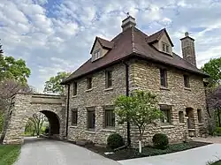 The Wilson House, located in Rochester, Minnesota on the grounds of Assisi Heights, was built between 1924-1925 and is a notable work by Rochester's most prominent architect Harold Crawford.[3] Made of local limestone with a red clay tile roof and sweeping limestone porte-cochère, it is a rare example of Cotswold-inspired Arts and Crafts architecture in southeastern Minnesota, featuring several of Crawford's signature elements including elaborate chimneys and ironwork.[4] Built at a cost of approximately $35,000 at the time, its interior includes a library finished in mahogany with an English parge ceiling.[5] At this location, Dr. Wilson engaged in many of his hobbies including studying ballistics, photography, and horticulture including apple breeding. At one point, Walnut Hill had fifteen acres of apple orchards including nine varieties of apples.[6] The Wilson House is owned and maintained by Mayo Clinic and is used for private functions; it is closed to the public but occasionally opens for historical tours held by the Sisters of Saint Francis.[1][7]