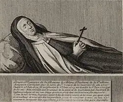 After her conversion, a confessor wanted to allow her to take communion immediately, but she refused, finding herself ‘unworthy’.[153] The second wife of Monsieur, Elizabeth Charlotte of the Palatinate recounts questioning La Vallière about why she remained a ‘suivante’ (a servant or companion) of Montespan. She replied that she wished to ‘do penance [...] suffer[ing] what was most painful for her, to share the King's heart [with another woman] and see herself despised by him [...], offer[ing] all her pains to God as atonement for her past sins; for, since her sins had been public, her penance had to be public too’.[154] Courtiers saw her new religiousness as a hypocritical ploy to achieve material gains from the King.[155] Her potential marriage was mentioned again, possibly to Lauzun. In late June 1670, Madame died. She agonised for a long time and believed that she had been poisoned.[156] La Vallière was present at her deathbed.[157] In her last hours, she was told by a canon, Nicolas Feuillet, that ‘all [her] life had been but sin’, and she repented publicly. When she complained of excruciating pain, Feuillet told her to embrace the suffering and think of God.[158] Courtiers remained under the impression of Madame's sudden death and her repentance for a long time.[159]