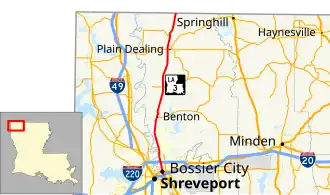 Louisiana Highway 3 (LA 3) is a state highway located in Bossier Parish, Louisiana. It runs 35.71 miles (57.47 km) in a north–south direction from the junction of Interstate 20 (I-20), U.S. Highway 71 (US 71), and LA 72 in Bossier City to the Arkansas state line north of Plain Dealing.