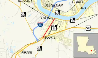 The route serves as the main north–south thoroughfare of Luling, located on the west bank of the Mississippi River, and connects it with US 90 at Boutte.