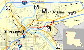 LA 72 was created with the 1955 renumbering, following only the portion of the current route east of LA 3.[11] When I-20 was opened through the area in 1966,[12] US 71 began to follow the parallel interstate alignment from exit 20B–C westward across the Red River Bridge. LA 72 was then extended to follow the old route along Barksdale Boulevard west to Traffic Street and north onto Traffic Street to US 79/US 80.[13][14] (The Traffic Street segment had been used as a connector during various times when US 71 was routed over the Long-Allen Bridge; its original state route designation in the 1955 renumbering was LA 782-3.)[15][16] The Traffic Street connector was returned to local control in the 2000s,[3][17] followed by the portion of Barksdale Boulevard west of Hamilton Road in 2016,[1] giving LA 72 its current western terminus. As of 2019, the portion of LA 72 from Hamilton Road to LA 3 is under agreement to be removed from the state highway system and transferred to local control.[18]