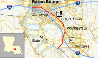 Louisiana Highway 73 (LA 73) is a state highway in Louisiana stretching from Geismar to Baton Rouge. LA 73 was built as a bypass to the backbends of River Road. It was soon after bypassed itself in a more complete way with U.S. Route 61 (Airline Highway).