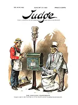 Anti-lottery cartoon depicting the Company's usage of the U.S. Postal Service prior to the banning of interstate lottery ticket sales by Congress. (Judge, 23 Aug 1890)