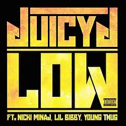 "Low" is a song by the American rapper Juicy J featuring Lil Bibby, Young Thug and Nicki Minaj. It was released on August 7, 2014, intended as the first single from Juicy J's fourth album. However, it fared poorly commercially and was removed from the project. "Low" was written by Juicy J, Nicki Minaj, Lil Bibby, Dr. Luke, Rock City, and Cirkut. It was produced by Dr. Luke and Cirkut.[1] The song received positive reception from music critics, most of it for Nicki Minaj's appearance. A music video directed by Benny Boom was created to promote the single.