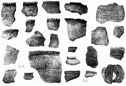 The cultural phases are divided into "Early" with prevalent stucco ceramics (late 7-8th century), "Middle" or "Developed" with partially wheel-made pottery (earliest since 761,[12] but usually 9th century), and "Late" with predominant wheel pottery (10th century).[1][3] Generally, the ceramic is predominantly of conic pots with enlarged upper part and bent rim, also bowls and frying pans.[1][2][3] The pottery has ornamental lines, bands, rims and holes.[13]