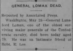 - ^ a b c d "Generals of the Confederacy - Lunsford Lindsay Lomax". Alexandria Library. 2012-02-07. Archived from the original on 2012-02-07. Retrieved 2020-04-21.