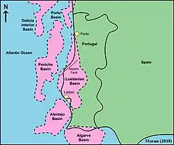 The Lusitanian Basin is a rift basin remnant located on both the mainland and continental shelf off the west-central coast of Portugal. It covers an area measuring 20,000 square kilometres (7,700 sq mi)[1] and extends north-south from Porto to Lisbon.[2] The basin varies between approximately 130 kilometres (81 mi) and 340 kilometres (210 mi) in width and belongs to a family of periatlantic basins such as the Jeanne d'Arc Basin. To the east of the Lusitanian Basin lies the Central Plateau of the Iberian Peninsula. A marginal horst system lies to the west. The Alentejo and Algarve Basins connect to the southern end of the Lusitanian Basin. In the north, it connects to the Porto and Galicia Basins via an undersea ridge.[3]