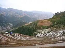 Local farmers needed to develop special water distribution channels to deal with the lack of water and the high altitude topography.[4] In response to this challenge, the Hmong people developed a way to retain water by levelling the land on the mountain in layers, resulting in the rice terrace fields' distinctive look. The terraces stretch across 2,200 hectares of the mountainside as narrow layers of terraces ranging from 1 to 1.5 m (3 to 5 ft) wide.