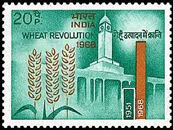 Swaminathan and Norman Borlaug collaborated, with Borlaug touring India and sending supplies for a range of Mexican dwarf varieties of wheat, which were to be bred with Japanese varieties.[45] Initial testing in an experimental plot showed good results. The crop was high-yield, good quality, and disease free.[46] There was hesitation by farmers to adopt the new variety whose high yields were unnerving.[46] In 1964, following repeated requests by Swaminathan to demonstrate the new variety, he was given funding to plant small demonstration plots. A total of 150 demonstration plots on 1 hectare were planted.[46] The results were promising and the anxieties of the farmers were reduced.[46] More modifications were made to the grain in the laboratory to better suit Indian conditions.[47] The new wheat varieties were sown and in 1968 production went to 17 million tonnes, 5 million tonnes more than the last harvest.[48]