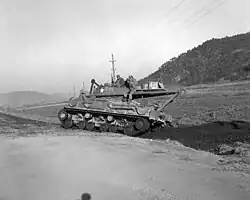 Some M32B1s were also shipped to Britain under lend-lease, where they were designated the ARV Mark III by the British Army.[13] In 1944, the Ordnance Department experimented with the M26 Pershing-based T12 Armored Recovery Vehicle, but it became too expensive and was never put on the production line.[14] The M32 was also planned to have mine-exploding equipment, such as the T1E1 Earthworm and the T2E1 Mine Exploder. However, only the T1E1 had any service with the vehicle.[15]