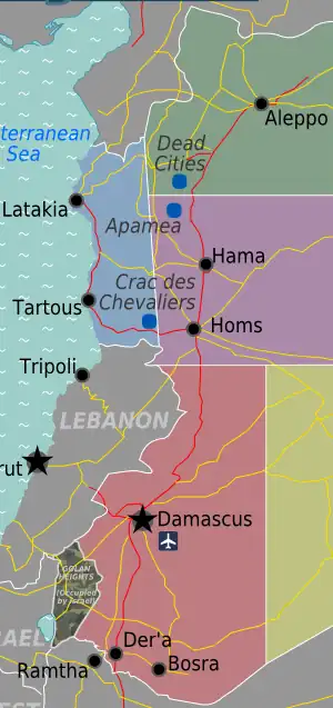 The M5 motorway is the most important motorway in Syria due to its length and function as the country network's south-north backbone. It is known as the "International Road."[1] It connects the border with Jordan in the south with Damascus, the country's political capital, and continues further north through Aleppo, the country's economic capital and second largest city, to the border with Turkey in the north.[1][2]