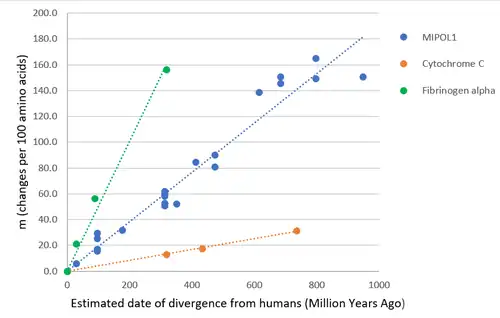 Using a linear regression analysis on a plot of corrected percent divergence (amino acid changes per 100 amino acids) as a function of date of divergence from humans for different MIPOL1 orthologs (see Fig.5), it is estimated that a 1% change in amino acids in the MIPOL1 protein takes 5.68 million years. MIPOL1 protein is evolving at a moderate rate relative to fast evolving protein such as fibrinogen alpha, and slow evolving proteins such as cytochrome C.
