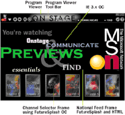 Once installed, members accessed MSN content through the MSN Program Viewer, which was essentially an animated, stylized and streamlined Internet Explorer shell interface on top of an Internet Explorer 3.0 web browser. When members signed in, they would be presented with the several different "Channels", which were categories for the various types of content available on MSN.