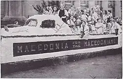 The organization was formed in 1922.[8] The organization managed to bring together Macedonian immigrants, primarily from Greek Macedonia.[9] Fort Wayne in Indiana was chosen as the site for the first formative convention, which took place on October 2, 1922, with a handful of delegates, most of whom were Ilinden veterans.[3] The first convention charted a framework within which to build the structure of the new organization. It was founded as an overseas branch of the Internal Macedonian Revolutionary Organization (IMRO), to lobby for the solution of the Macedonian Question in the League of Nations and with the US government.[10][11] The name selected for the organization was the "Macedonian Political Organization" which remained its name until 1952. Its adopted slogan was 'Macedonia for the Macedonians'.[10]