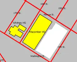 Irving E. Macomber Vocational Technical High School was a vocational public high school in Toledo, Ohio, United States, from 1938[1] to June 1991. It was named for the man who helped develop the city's schools and parks, and who used to live on the property the school was built on.[1] Macomber served the entire city and was part of the Toledo Public School District. The school began as Vocational High School in the original Toledo high school in 1927[2] before moving to its location on Monroe Street in 1938.[3] In 1959, the school became joint-operational with Whitney High School, an all-girls vocational school located just across 16th St., and the two buildings came to be known as Macomber-Whitney.[4] The building still sits on Monroe Street, just northwest of Fifth Third Field.