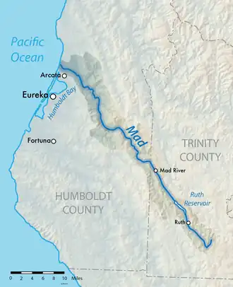 The Mad River (Wiyot: Baduwa't[4]) is a river in upper Northern California. It flows for 113 miles (182 km)[3] in a roughly northwest direction through Trinity County and then Humboldt County, draining a 497-square-mile (1,290 km2) watershed into the Pacific Ocean north of the city of Arcata near Arcata–Eureka Airport[5] in McKinleyville. The river's headwaters are in the Coast Range near South Kelsey Ridge.