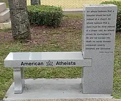 In 2013, the first atheist monument to be erected on American government property was unveiled at the Bradford County Courthouse in Florida, where other residents had installed a monument to religious ideals (in this case, a replica of the Ten Commandments). It is a 1,500-pound granite bench and plinth inscribed with quotes by O'Hair, Thomas Jefferson, and Benjamin Franklin. The American Atheists said at the time that they planned to build 50 more monuments.[49][50]