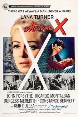 Madame X is a 1966 American suspense drama film[2] directed by David Lowell Rich and starring Lana Turner, John Forsythe, Ricardo Montalbán, Burgess Meredith, Constance Bennett, and Keir Dullea. Based on the 1908 play of the same name by French playwright Alexandre Bisson, it follows Holly Anderson, the wife of a wealthy American diplomat who, under the pressure of her mother-in-law, fakes her death after the demise of her lover. Holly spends the following fifteen years abroad under a false identity before becoming embroiled in a legal battle after she commits a murder, during which she is unknowingly represented by the son—now a successful attorney—whom she was forced to abandon.