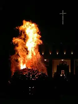 Since 1870, on 26 April at dusk the so-called focaracci[20] are kindled in all the town districts. They are devotional bonfires in honour of the Madonna di Pietraquaria, similar to the Beltane bonfires. Around them popular and religious songs and small music concerts are performed.[21] According to a legend the tradition of focaracci arose from a dispute between the populations of Avezzano and Cese about whom merited the Virgin's protection. From the top of Mount Salviano the Madonna turned towards the city of Avezzano to look at the bonfires that were lit by Avezzanese people in order to draw her attention.[22]