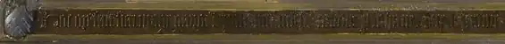 The frame is richly inscribed, with van Eyck's signature, the coats of arms of both Van der Paele's paternal and maternal families,[16] lettering identifying each of the two attendant saints, and a passage praising the Virgin.[15] The inscriptions are painted in an illusionistic manner. Those on the lower border appear to be in raised cast brass lettering, those on the order borders appear to have been cut into the frame's timber.[34]