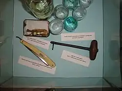 Ancient medical tools for barber surgeons: razor, knife for bloodletting, hook for tooth extraction and cups for fire cupping.