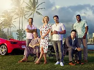 Kimee Balmilero, Taylor Wily, and Dennis Chun all appeared as their Hawaii Five-0 characters throughout the first season.[40] Chun guest starred on the original Magnum, P.I. as various minor characters throughout its run.[41] Domenick Lombardozzi, Ken Jeong, and Christopher Thornton were cast in recurring roles.[42][43][44] Actor and former football player Carl Weathers, MLB baseball player Christian Yelich, and NASCAR driver Ryan Blaney all appeared as guest stars.[43][45][46] Betsy Phillips, series star Zachary Knighton's wife, first appeared in the second season's final episode.[47]