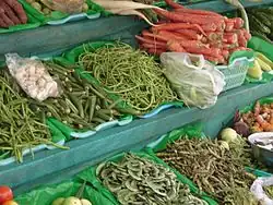 Until recently, canned or frozen food was not widely available in India. Therefore, the vegetables used in a meal widely depended on seasonal availability. In Maharashtra, spring (March–May) is the season of cabbages, onions, potatoes, okra, guar and tondali,[26] shevgyachya shenga, dudhi, marrow and padwal. During the Monsoon season (June–September) green leafy vegetables, such as aloo (Marathi: आळू), or gourds such as karle, dodka and eggplant become available. Chili peppers, carrots, tomatoes, cauliflower, French beans and peas become available in the cooler climate of October to February.[27] Coal fired roasted young cobs of Sorghum (Jwari) is a popular item during winter picnics to the farms.[28] Vegetables are typically used in making bhaajis (Indian stew). Some bhaajis are made with a single vegetable, while others are made with a combination. Bhaajis can be "dry" such as stir fry or "wet" as in the well-known curry. For example, fenugreek leaves can be used with mung dal or potatoes to make a dry bhhaji or mixed with besan flour and buttermilk to make a curry preparation.[29] Bhaaji requires the use of goda masala, consisting of a combination of cloves, corriander powder, cumin, cinnamon, asafoetida, etc. and kanda-lasun masala made up of onion, garlic, ginger, red chilli powder, green chillies, turmeric and mustard seeds.[30][31] Depending on a family's caste or specific religious tradition, onions and garlic may be excluded. For example, a number of Hindu communities from many parts of India refrain from eating onions and garlic altogether during chaturmas, which broadly equals the monsoon season.[32]