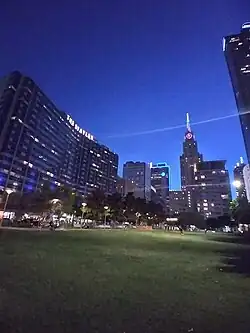The Main Street District of downtown Dallas, Texas (United States) runs along Main Street and is bounded by Elm Street one block north, Commerce St. one block south, N. Lamar St. to the west, and US 75/I-45 (I-345) elevated highway to the east. The district is the spine of downtown Dallas, and connects many of the adjoining business and entertainment districts. The Main Street District excludes a small portion at the western end of the three parallel streets, which is where the John Fitzgerald Kennedy Memorial and Dealey Plaza are situated. That area falls within the neighboring West End Historic District.