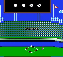 There are a limited number of effects and, aside from brief ballpark jingles, there is no real background music present during the game. For example, the charge fanfare is played at random points and the introductory screen begins with a different baseball tune while the player is loading up and selecting his team, along with a home run fanfare. Generic sound effects include the bat cracking upon contact with the ball, the sound of the ball flying through the air during a pitch, bouncing and throwing effects, and a stream of crowd noises.