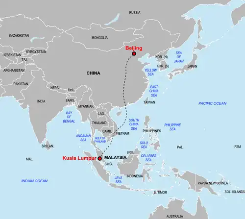 Flight 370 was a scheduled flight in the early morning of Saturday, 8 March 2014, from Kuala Lumpur, Malaysia, to Beijing, China. It was one of two daily flights operated by Malaysia Airlines from its hub at Kuala Lumpur International Airport to Beijing Capital International Airport—scheduled to depart at 00:35 local time (MYT; UTC+08:00) and arrive at 06:30 local time (CST; UTC+08:00).[59][60] On board were two pilots, 10 cabin crew, 227 passengers, and 14,296 kg (31,517 lb) of cargo.[26]: 1, 12, 30