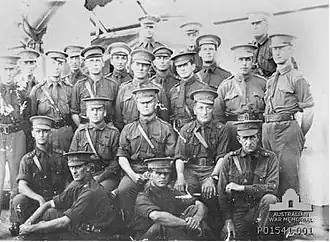 2. ^ Although the Australian War Memorial's card reference ([1]) claims that Robert Nimmo was a "Major"; no doubt due to the single "thing" on his shoulder, which was, obviously, thought to be a "crown", rather than what it must have been: a "bath star" or "pip" (see British Army officer rank insignia). Nimmo's service record ([2], page 27) clearly shows that he was a (two "pip") Lieutenant at the time of the photograph. Perhaps Nimmo had borrowed a shirt from a (one "pip") Second Lieutenant for the photograph.