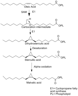 - ^ Hooper, N. K.; Law, J. H. (1965). "Biosynthesis of cyclopropane compounds VII. Synthesis of cyclopropane and cyclopropene fatty acids by seedlings". Biochemical and Biophysical Research Communications. 18 (3): 426–9. doi:10.1016/0006-291X(65)90725-4. PMID 14300760.