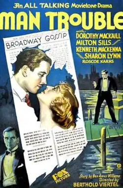 Man Trouble is a 1930 American pre-Code musical drama film directed by Berthold Viertel and written by Marion Orth, George Manker Watters and Edwin J. Burke. The film stars Milton Sills, Dorothy Mackaill, Kenneth MacKenna, Sharon Lynn, Roscoe Karns and Oscar Apfel. The film was released on August 24, 1930, by Fox Film Corporation.[1][2][3]