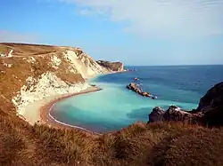 Man o' War Cove (or Man of War Bay and similar names) lies on the Dorset coast in southern England and is flanked by the rocky, steep and slightly projecting headlands of Durdle Door to the west and Man O War (or O' War) Head to the east. Its name is believed to be a corruption of the Brythonic 'Men-an-Vawr' (The Great Rock)[1]