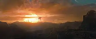 John "DJ" Desjardin served as the visual supervisor for Man of Steel, with Weta Digital, Moving Picture Company (MPC) and Double Negative providing the visual effects for the film.[116][117] Zack Snyder wanted the film to "appear very natural because there's some very fantastical things in there and he wanted people to suspend their disbelief, and we the visual effects team had to make it as easy as possible for them to do so." Desjardin noted that the intent in shooting the film was to use handheld devices to make the film feel like a "documentary-style" film. Desjardin said: "We had to think about what that would mean, since we also had to photograph some crazy action. So for a lot of the previs we did, we'd start to think where our cameras were and where our cameraman was. A lot of the rules are the Battlestar Galactica rules for the space cams that Gary Hurtzel [sic] developed for that miniseries, where we want to make sure if we're translating the camera at all it makes sense. Unless the action is so over the top, like in the end where Superman is beating up Zod—we had to break it a bit."[118]