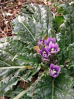 Mandragora autumnalis, known as mandrake[3] or autumn mandrake,[4] is recognized by some sources as a separate species from Mandragora officinarum, although with different circumscriptions. Others regard it as merely part of this very variable species. Plants given the name Mandragora autumnalis consist of a rosette of leaves up to 60 cm (2 ft) across, close to the ground, with a central group of usually purplish flowers followed by yellow or orange berries. The large tap-roots as well as the leaves contain alkaloids and are toxic. They have traditional uses as herbal medicines.