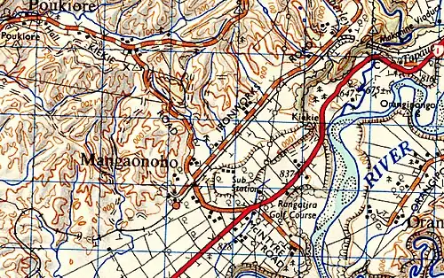 Mangaonoho railway station was a station on the North Island Main Trunk in New Zealand.[1][2] For almost a decade, from 1893 to 1902, Mangaonoho was important as the northern terminus of the NIMT's southern section; even a refreshment room was planned.[3] The route north was delayed by construction of major viaducts, the first being Makōhine. To build Makōhine a railway workshop was set up just north of Mangaonoho. Unlike many other NIMT construction camps, Mangaonoho gradually declined after the line was completed. By 1911 the population was down to 167.[4] Decline continued, with removal of the stockyards in 1973[3] and closure in 1982.[5] There is now only a single line through the former station site.[6]
