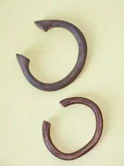 Manillas are a form of commodity money, usually made of brass, bronze, or copper, which were used in West Africa.[1] They were produced in large numbers in a wide range of designs, sizes, and weights. Originating before the colonial period, perhaps as the result of trade with the Portuguese Empire, manillas continued to serve as money and decorative objects until the late 1940s and are still sometimes used as decoration on arms, legs and around the neck. In popular culture, they are particularly associated with the Atlantic slave trade.[2]