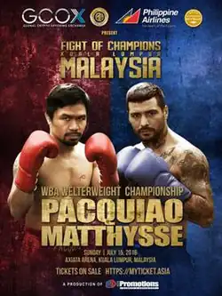 Manny Pacquiao vs. Lucas Matthysse, billed as Fight of Champions, was a boxing match for the WBA (Regular) welterweight championship.[2] The event took place on July 15, 2018 at the Axiata Arena in Kuala Lumpur, Malaysia.[3][4][5] Pacquiao won the fight by 7th-round TKO.[6]