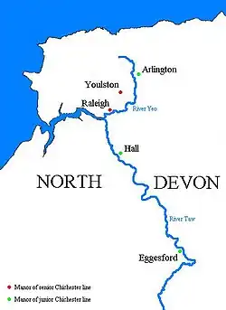 The historic manor of Raleigh, near Barnstaple and in the parish of Pilton, North Devon, England, was the first recorded home in the 14th century of the influential Chichester family of Devon. It was recorded in Domesday Book of 1086 together with three other manors that lay within the later-created parish of Pilton. The manor lies above the River Yeo on the southern slope of the hill on top of which stand the ruins of the Anglo-Saxon hillfort called Roborough Castle.[2] Part of the historic manor of Raleigh is now the site of the North Devon District Hospital.