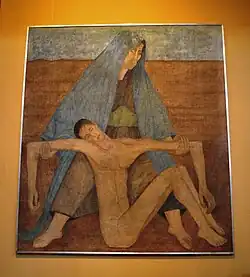 During his career, the artist created two murals. The first was while he was in Lecumberri, called Piedad en el desierto, notable as the start of his “white” stage of artistic production. This work was later moved to the Palacio de Bellas Artes and restored in 1967.[3] In 1945 he painted the mural El holocausto, in Iturbe’s house, now the Isabel la Católica building.[3][8] For just these two murals some critics have stated that he should be considered among the best of Mexico’s muralists.[1][9] In 2011 the mural el holocausto was restored over several months by noted art restorer Monica Baptista. In 2019 a tapestry after the mural el holocausto was commissioned by Bill Shipsey founder of Art for Human Rights (formerly Art for Amnesty) and created by Ateliers Pinton in Aubusson, France https://www.lamontagne.fr/felletin-23500/loisirs/une-tapisserie-monumentale-realisee-a-felletin-creuse-portera-le-message-d-amnesty-international-dans-le-monde-entier_13732773/. It was first exhibited at UNESCO in Paris https://www.amnesty.fr/agenda/holocausto-a-la-maison-de-lunesco and subsequently at Seminario 12 in Mexico City and the GPO in Dublin https://www.rte.ie/news/2023/0606/1387767-tapestry-gpo/. It is currently on display in the Hôtel de Breteuil in Paris.