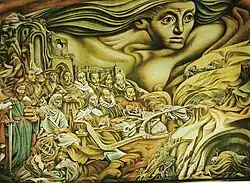 Suárez built a workshop for Siqueiros in Cuernavaca, La Tallera, to help him work as efficiently as possible.[14] The Polyforum has twelve huge exterior panels holding murals by Siqueros that depict the March of Humanity, showing the evolution from the past to the present and giving a view of the future. Most of the other surfaces of the building were also painted by Siqueros, making the building's exterior the largest mural in the world.[15] The exterior mural covers over 120,000 square feet (11,000 m2) and depicts the march of humanity on Earth towards the Cosmos. The interior depicts the march of humanity in Latin America.[11] Most of the murals of the Polyforum were taken from drawings that Siqueros made while in prison for his revolutionary opinions in 1960–1964.[11]
