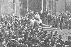 In 1896 together with other Carlist deputies and senators Solferino withdrew from the Cortes;[73] denying allegations that like in 1872, the act was introduction to Carlist insurgency, he nevertheless signed a letter lambasting the turnista system as corrupted and unsustainable.[74] The same year he took part in ambiguous gatherings hailing general Moore[75] and in 1898 he presented Carlos VII with an enigmatic gift.[76] His actual involvement in La Octubrada, a series of minor Catalan Carlist 1900 revolts,[77] is highly unclear.[78] Though scholars do not list him among those involved[79] and at the time of the disturbances he was together with other Carlist leaders in Paris,[80] contemporary press noted that Badalona raid originated from Torre Baró estate of his brother-in-law Sivatte.[81] Security forces searched his Barcelona palace tearing off the floor and allegedly discovered few rifles.[82] Solferino denied any involvement,[83] which did not spare him brief detention in 1901.[84]