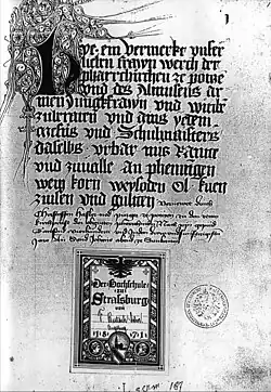 An urbarium of the parish church exists from the middle 15th century (1453–1460) in which the then church caretaker Christof Hasler the Elder registered the landed property and legal titles of the parish church. The manuscript is housed in the Bibliothèque nationale et universitaire de Strasbourg, where it ended up in 1871.[8]